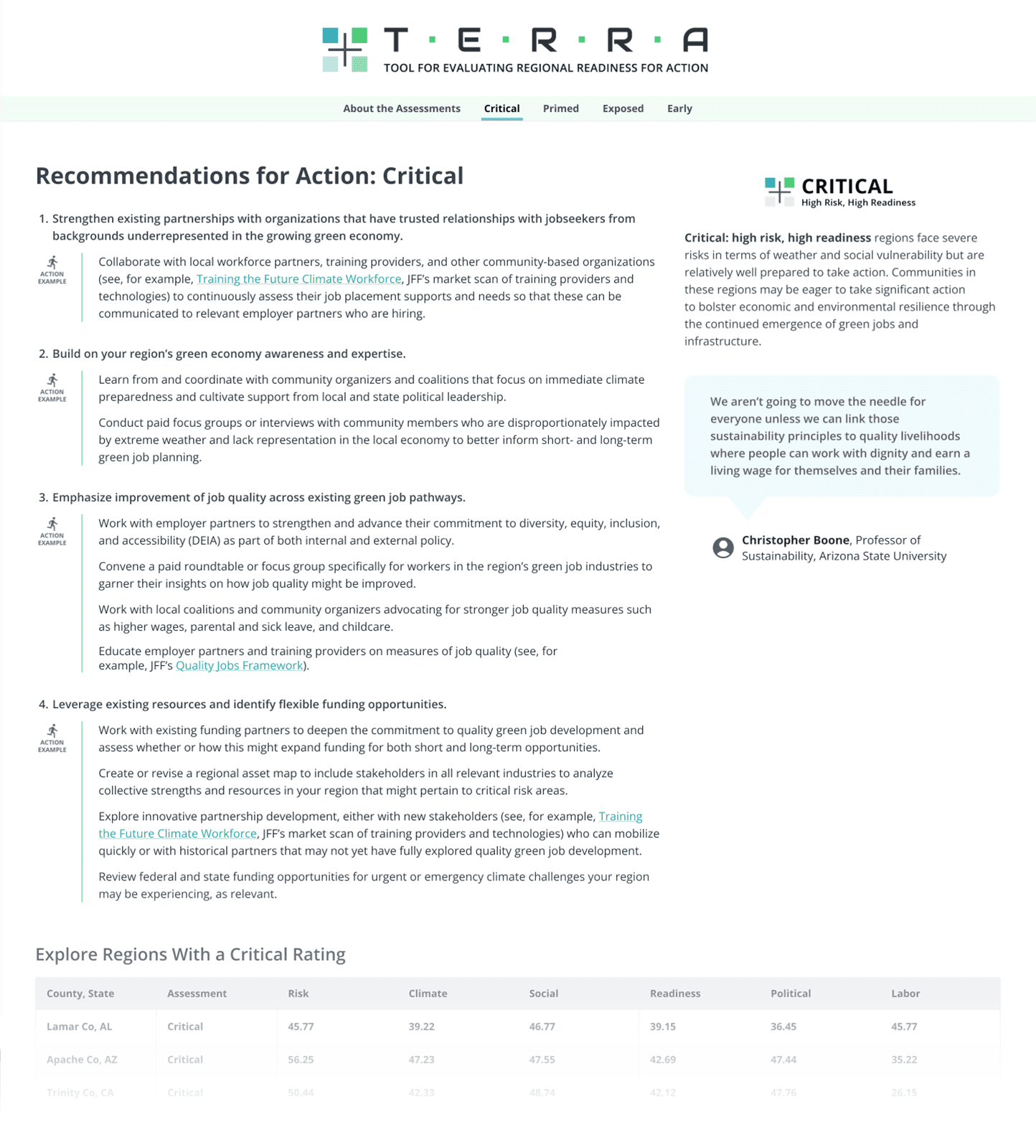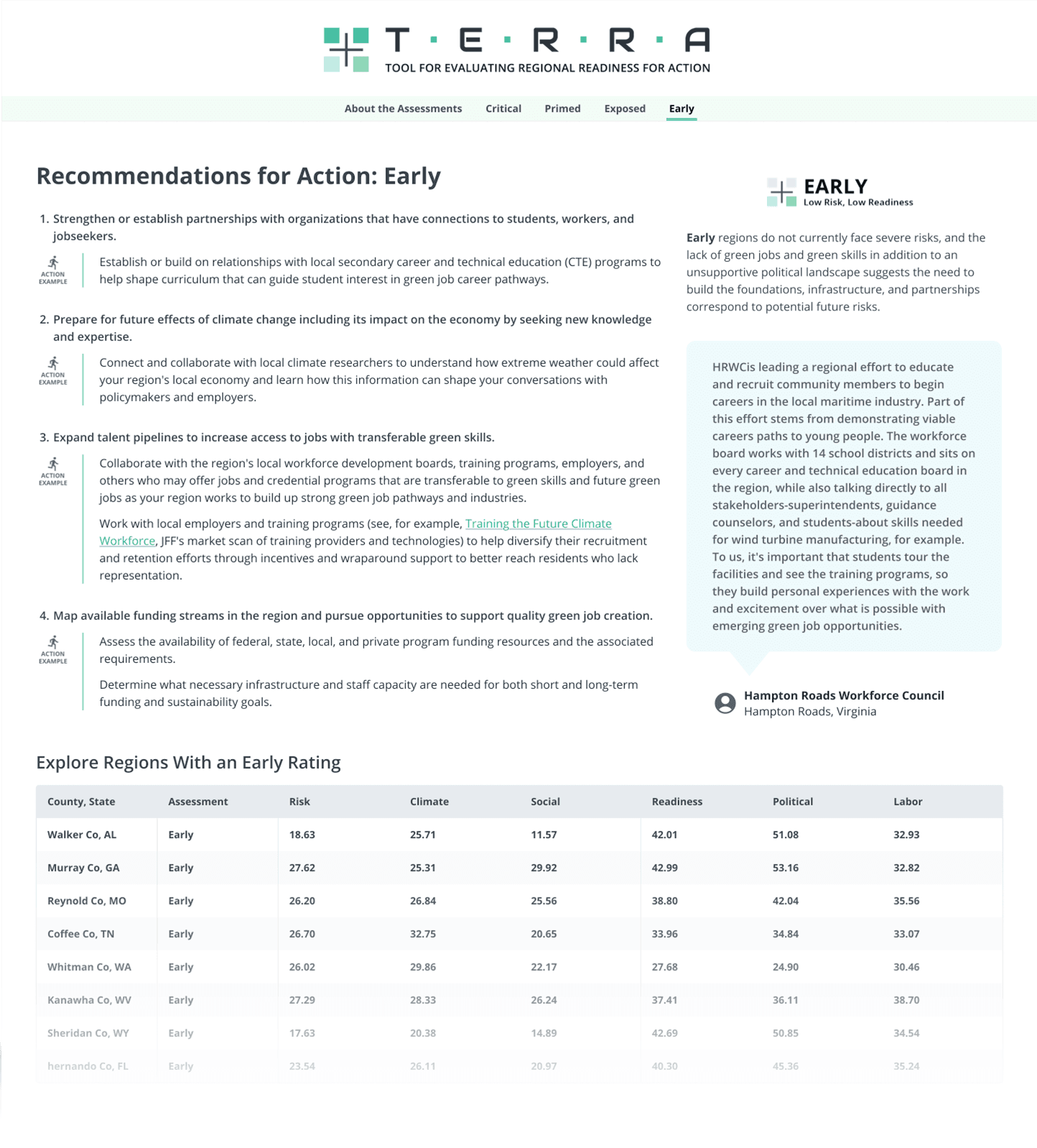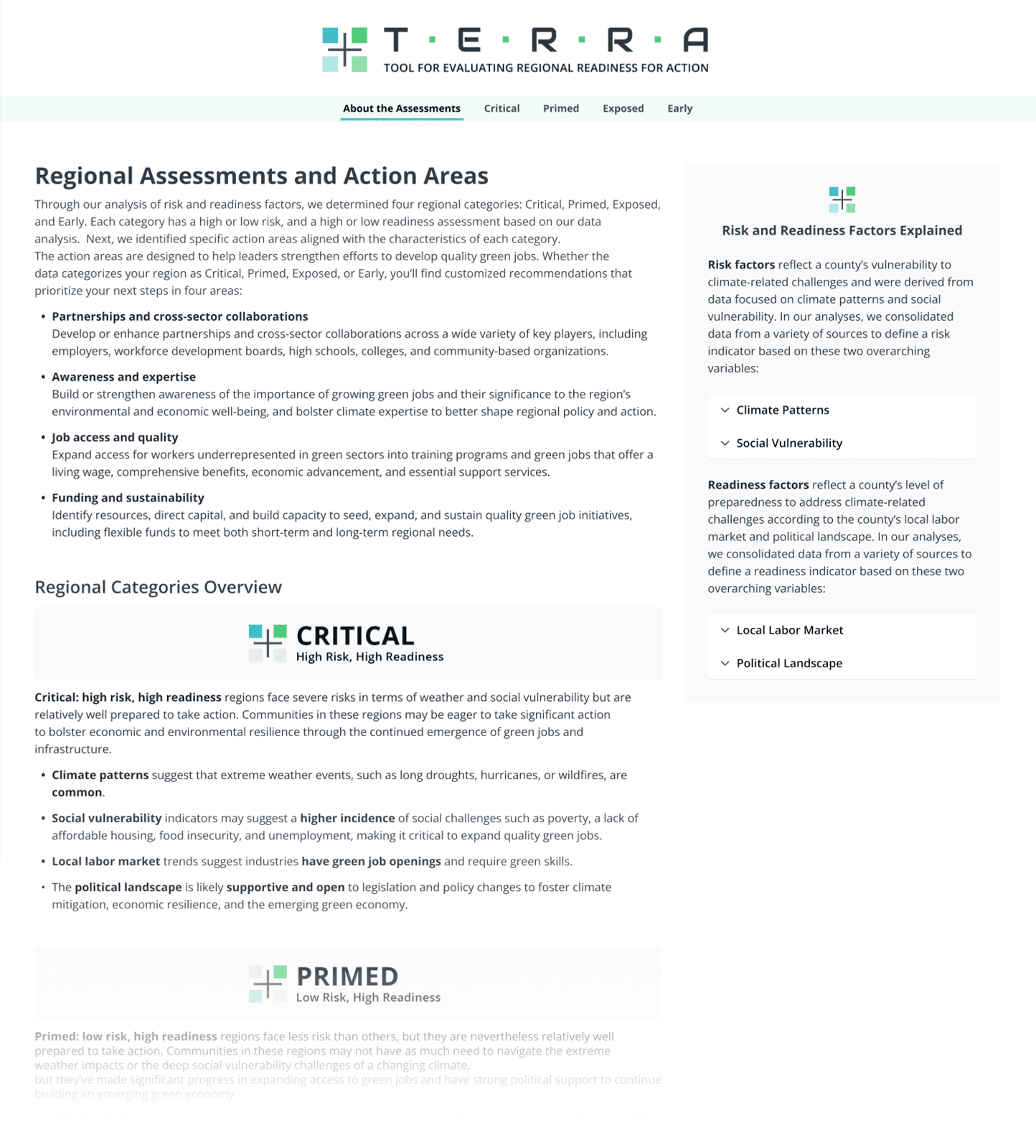 The TERRA tool translated regional climate risk and workforce readiness data into actionable categories of Critical, Primed, Exposed, and Early to guide regional planning decisions.