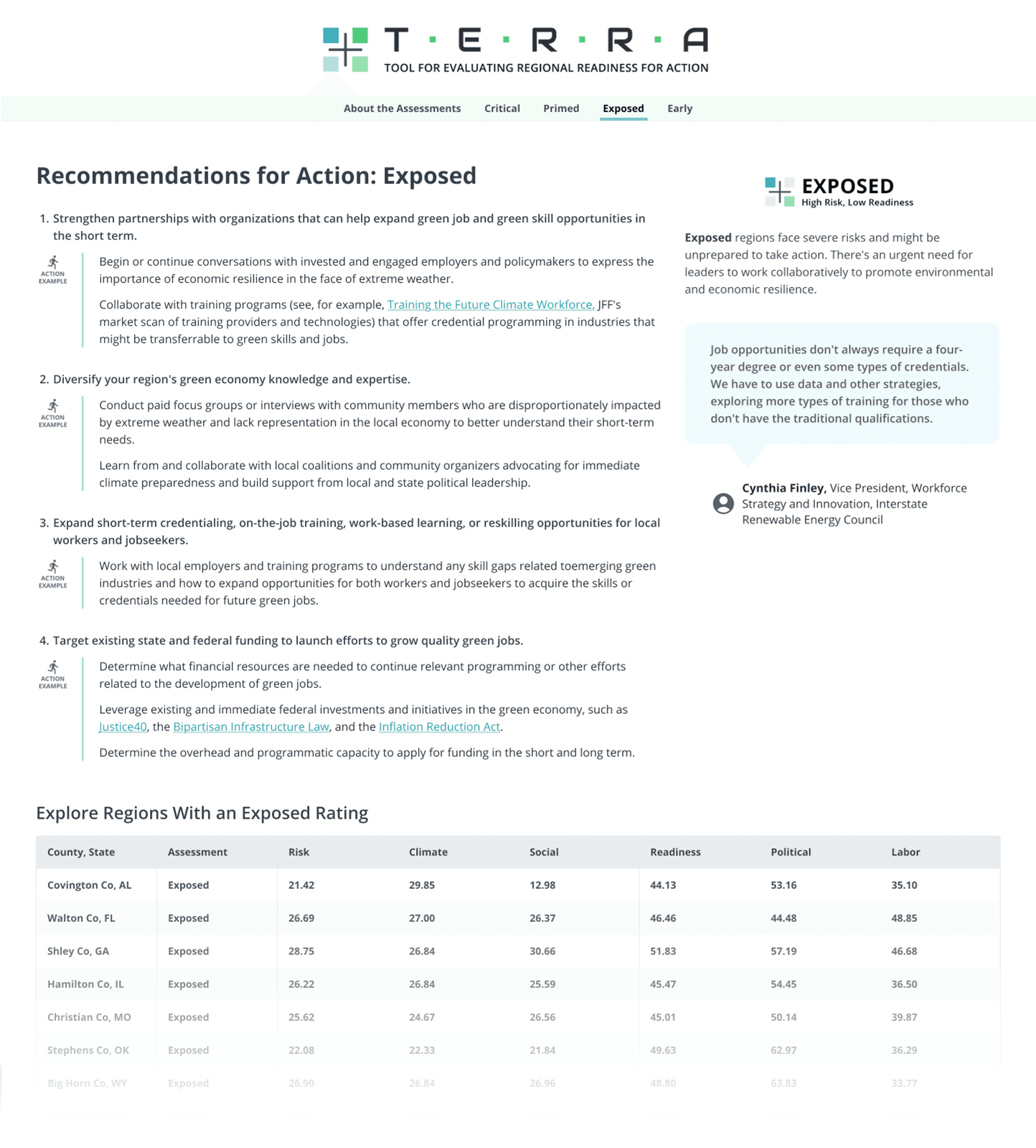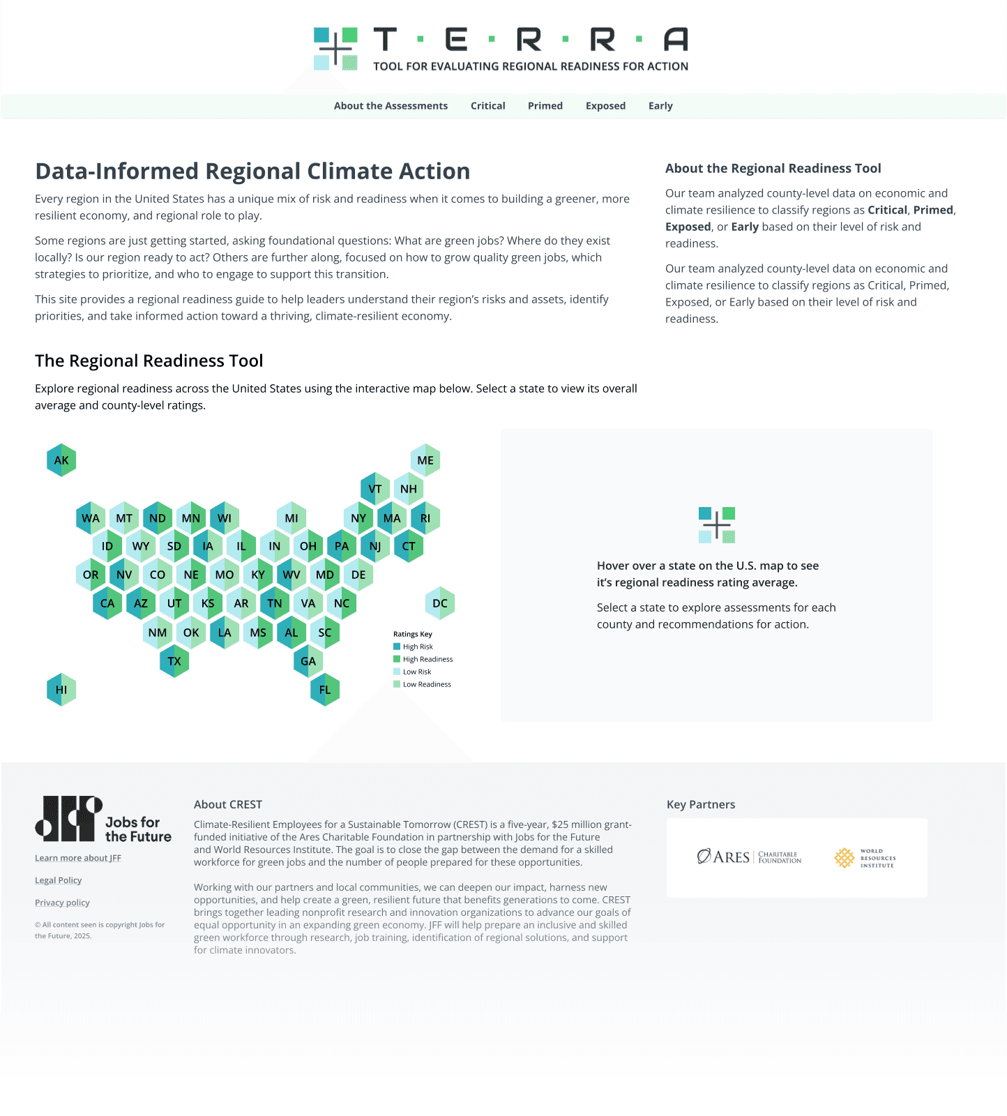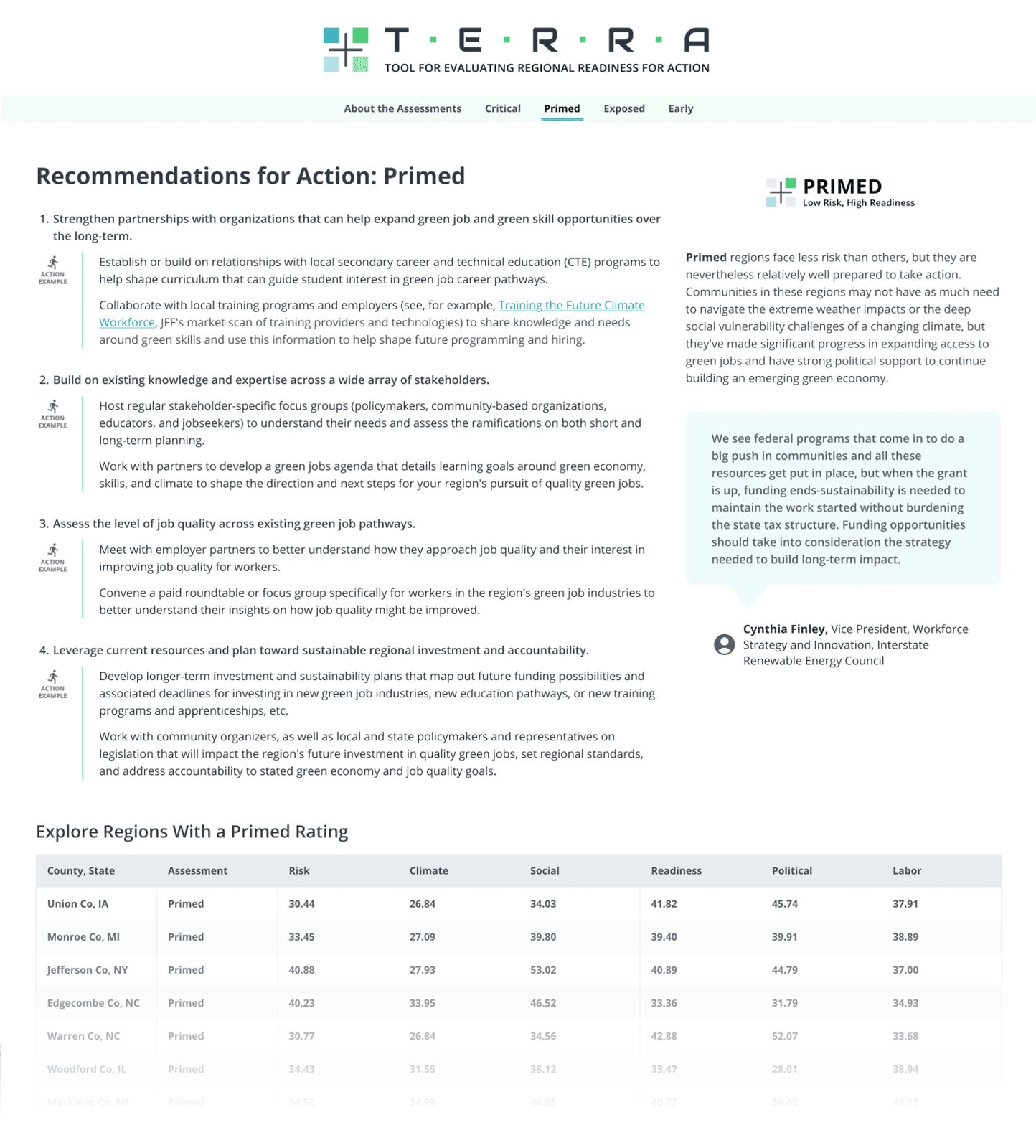 The TERRA tool translated regional climate risk and workforce readiness data into actionable categories of Critical, Primed, Exposed, and Early to guide regional planning decisions.