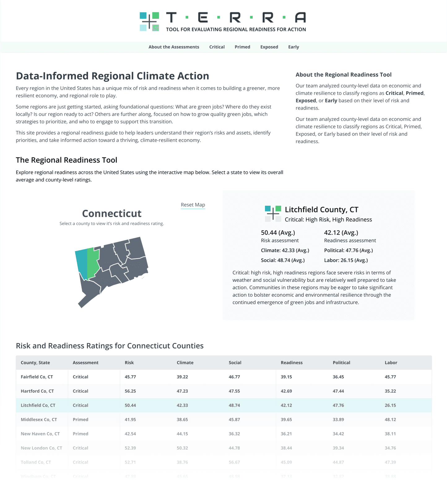 This prototype illustrates the intended interaction model for the TERRA site, including the regional readiness map and supporting data views. Hover across the map to explore state-level summaries, then select Connecticut to follow a fully prototyped pathway into county-level detail. The experience demonstrates how users move between high-level signals and localized insights.