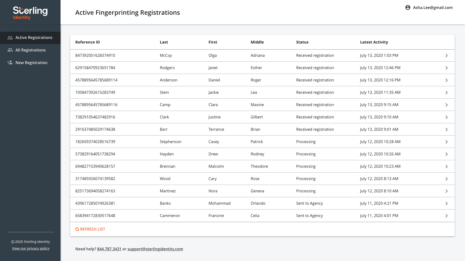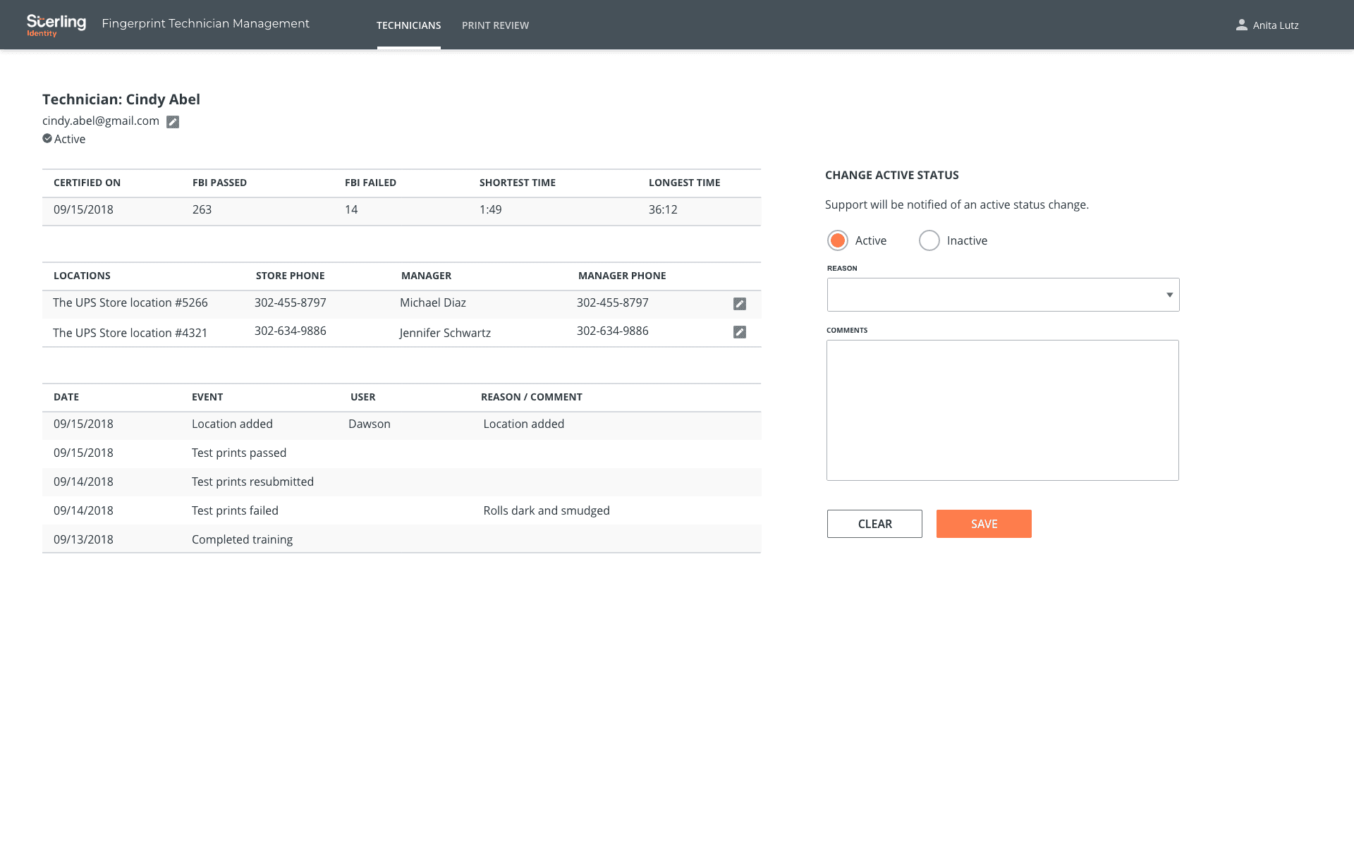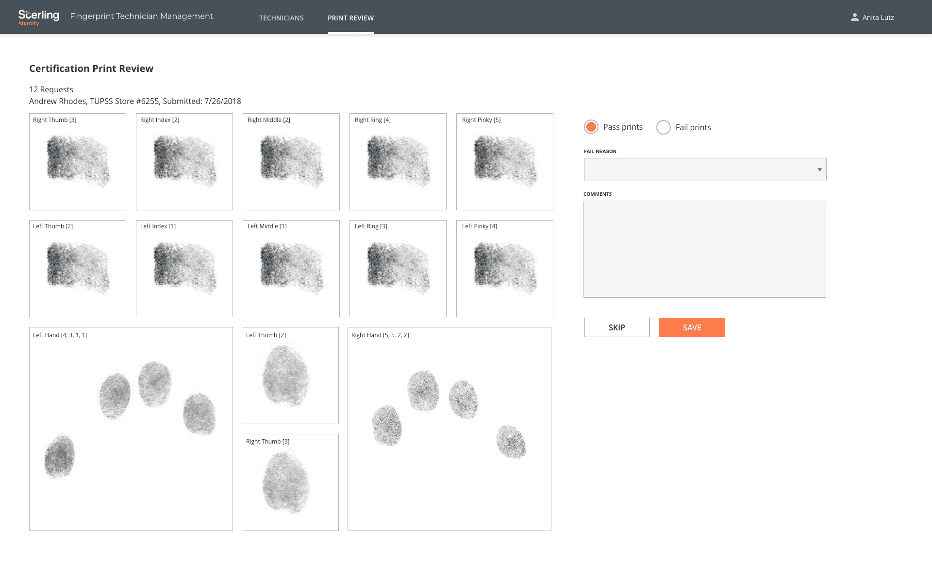 Technician management tools: Internal portal used by Sterling staff to manage field technicians and review fingerprint submission quality.
