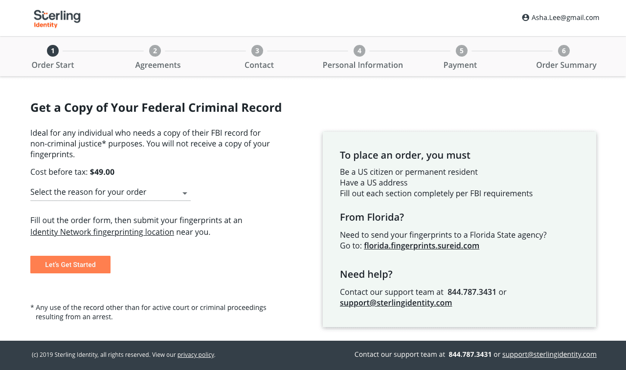 Consumer ordering interface: Responsive web experience for individuals requesting their FBI CHRI record.