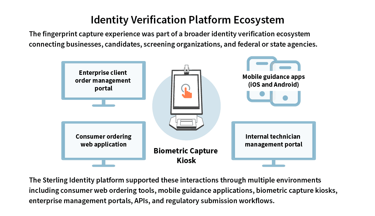 The fingerprint capture experience operated within a broader identity verification ecosystem. Businesses initiated background checks, candidates completed biometric capture at kiosks, technicians verified identity documents, and fingerprint submissions were transmitted to federal or state agencies for processing.