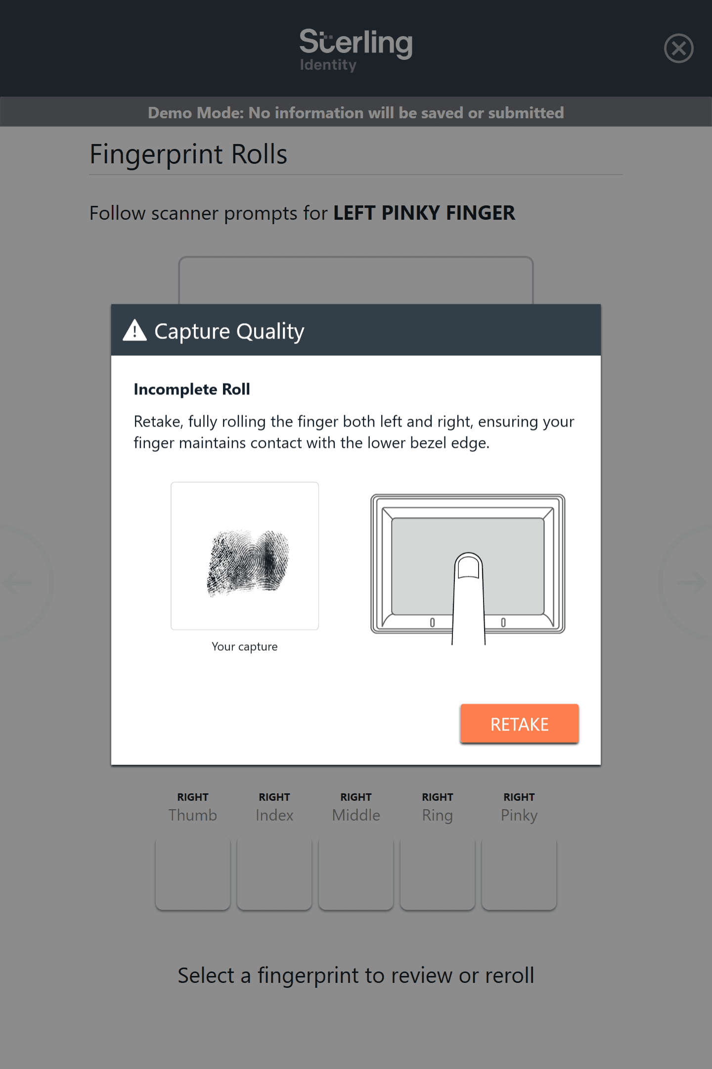 The third-party fingerprint capture hardware returned detailed issue codes that were not surfaced in the kiosk UI. When capture failed, users received little to no actionable feedback—leading to confusion, repeated attempts, and increased calls to customer support.