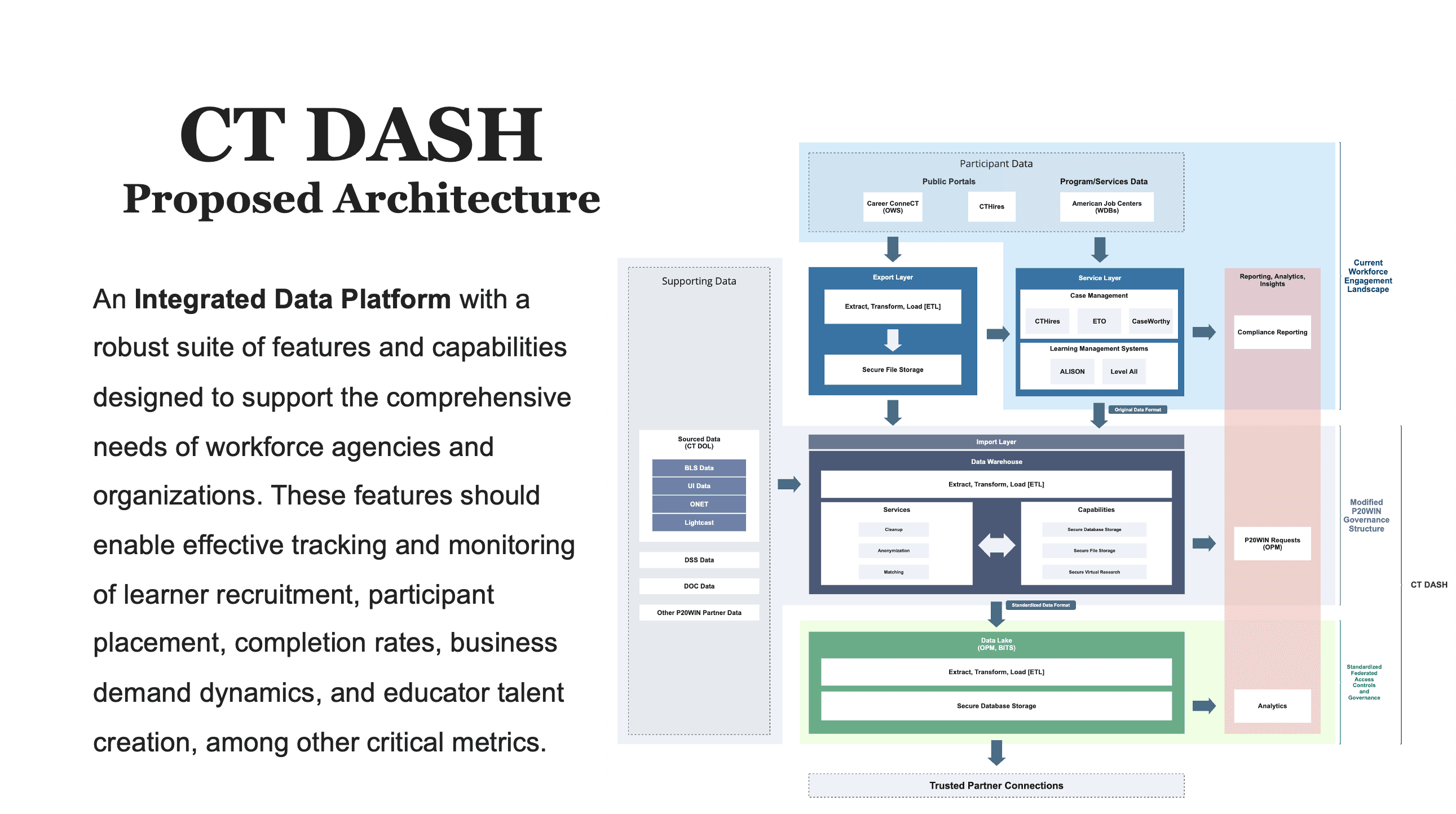 The architecture diagram illustrates how data from workforce programs, public portals, and labor market data sources could integrate into a centralized data warehouse and lake environment.