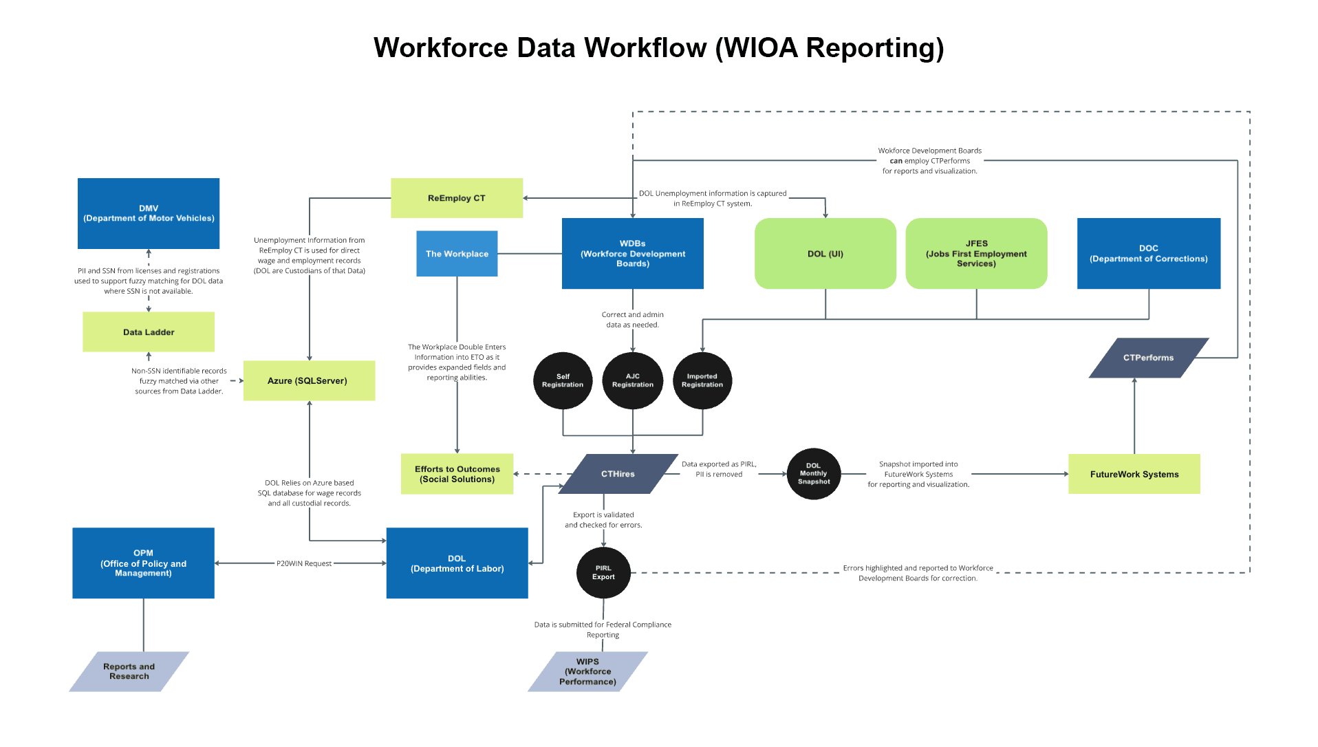 This diagram illustrates how participant and employment data moved between agencies, workforce boards, and federal reporting systems under the Workforce Innovation and Opportunity Act (WIOA).