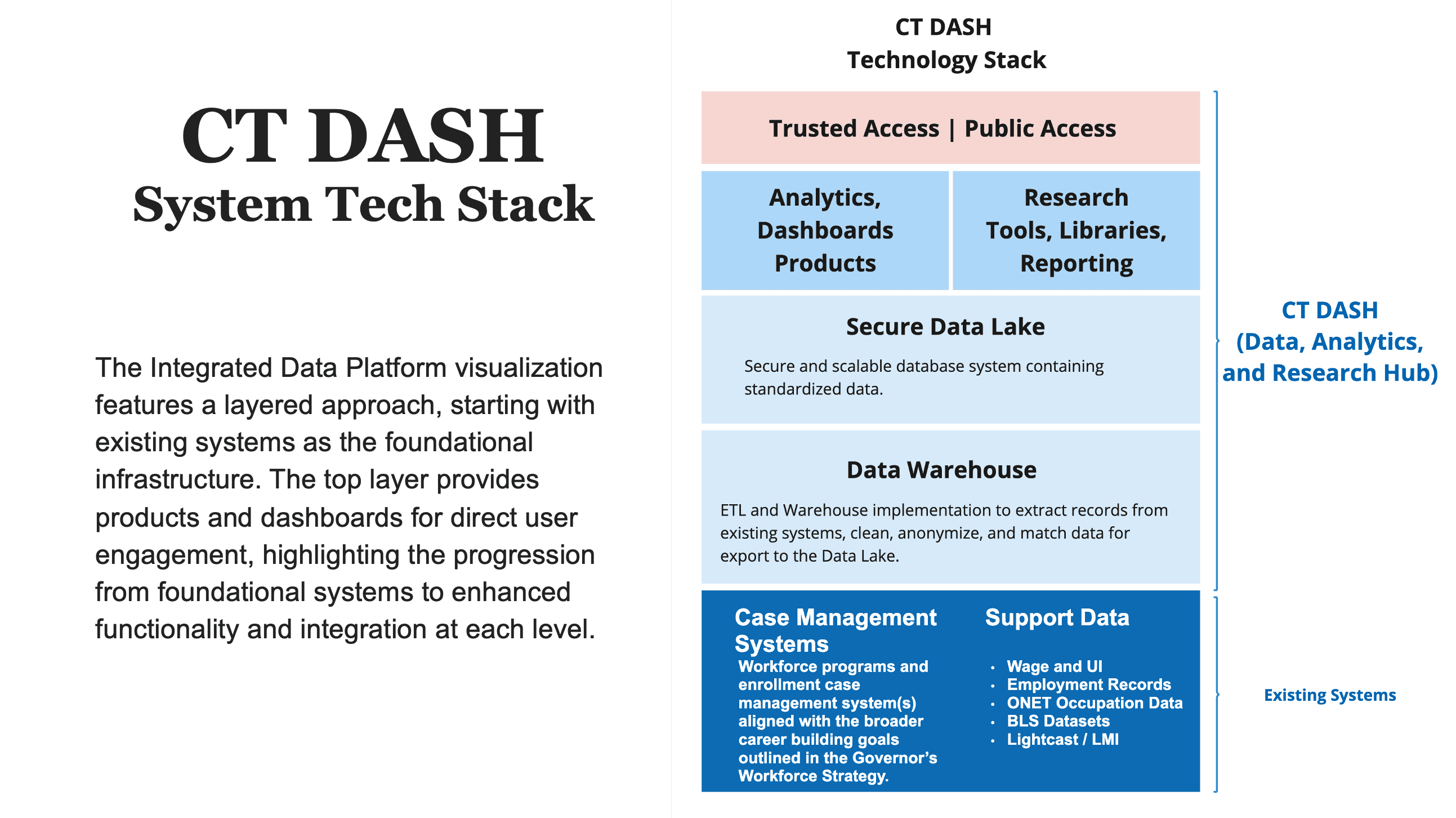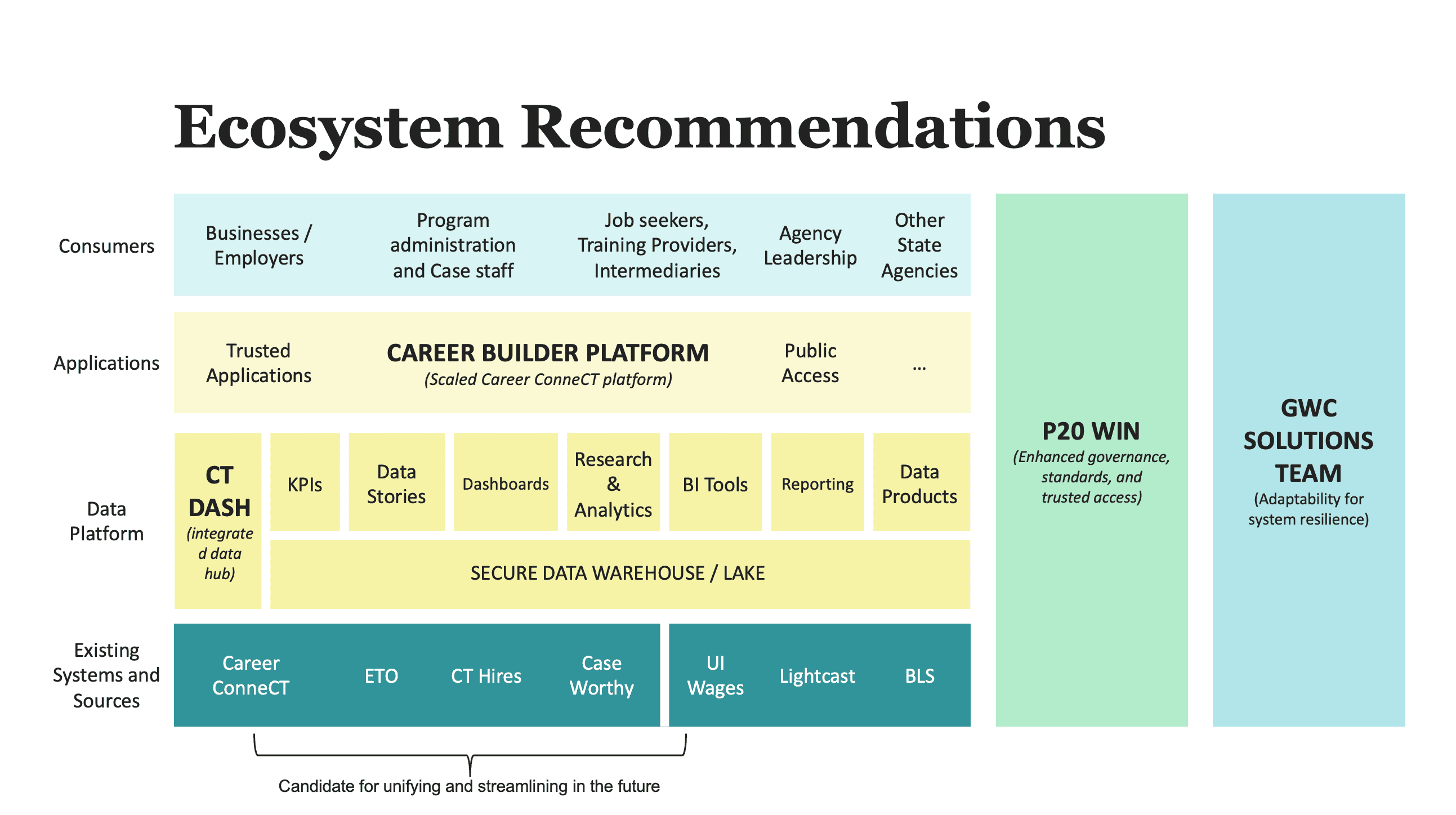 Working with a software architect, we explored how a layered data platform could integrate existing workforce systems while supporting analytics and reporting across agencies.